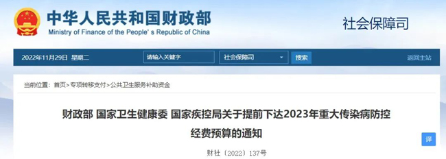 日前,國家財政部、國家衛(wèi)生健康委、國家疾控局三部門聯(lián)合發(fā)布了《財政部 國家衛(wèi)生健康委 國家疾控局關(guān)于提前下達2023年重大傳染病防控經(jīng)費預(yù)算的通知》。此次提前下達的2023年重大傳染病防控經(jīng)費共計156.4億元,相較于2022增長31%。